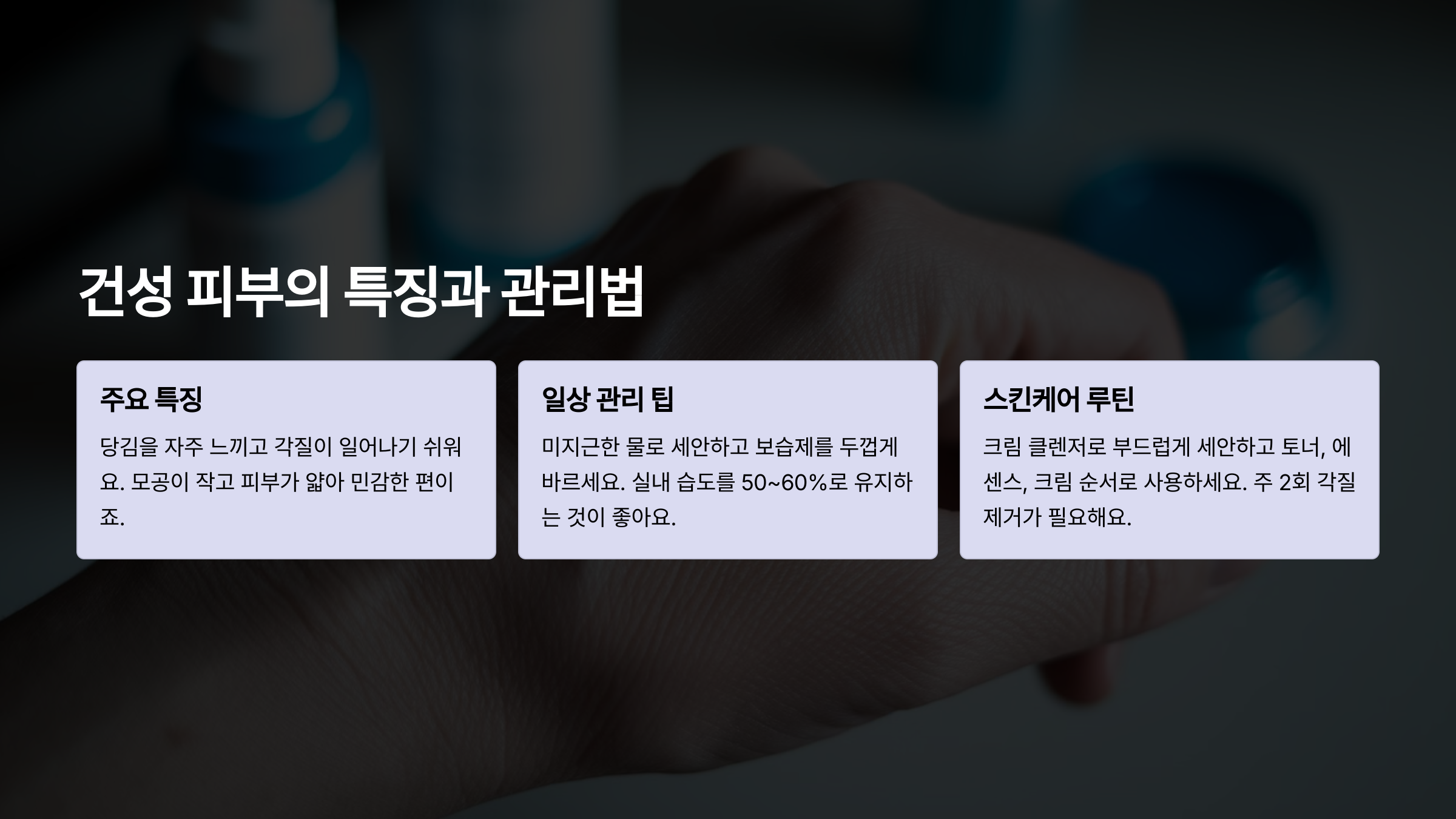건성 피부를 관리하려면 보습이 가장 중요해요! 피부 속까지 수분을 채울 수 있는 제품을 선택하는 것이 핵심이에요. 특히 히알루론산, 세라마이드, 스쿠알란 같은 보습 성분이 포함된 제품을 사용하면 피부 장벽을 강화할 수 있어요.