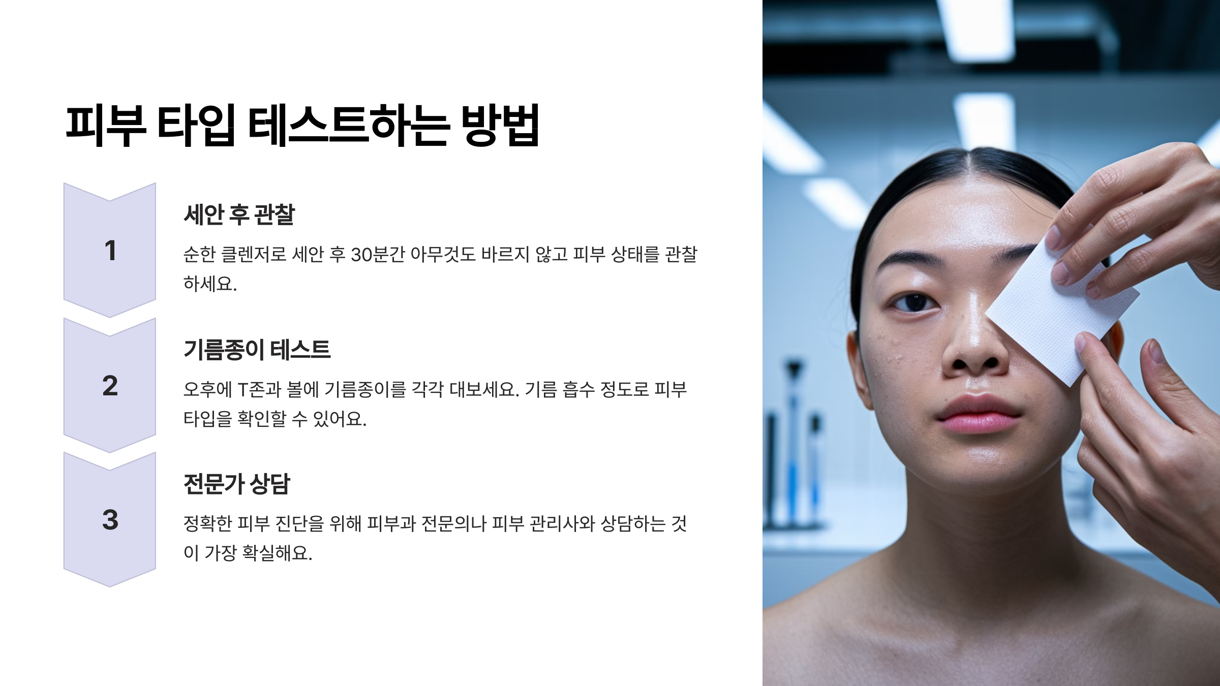 그럼 이제 내 피부 타입을 쉽게 확인할 수 있는 테스트 방법을 알아볼까요? 👉