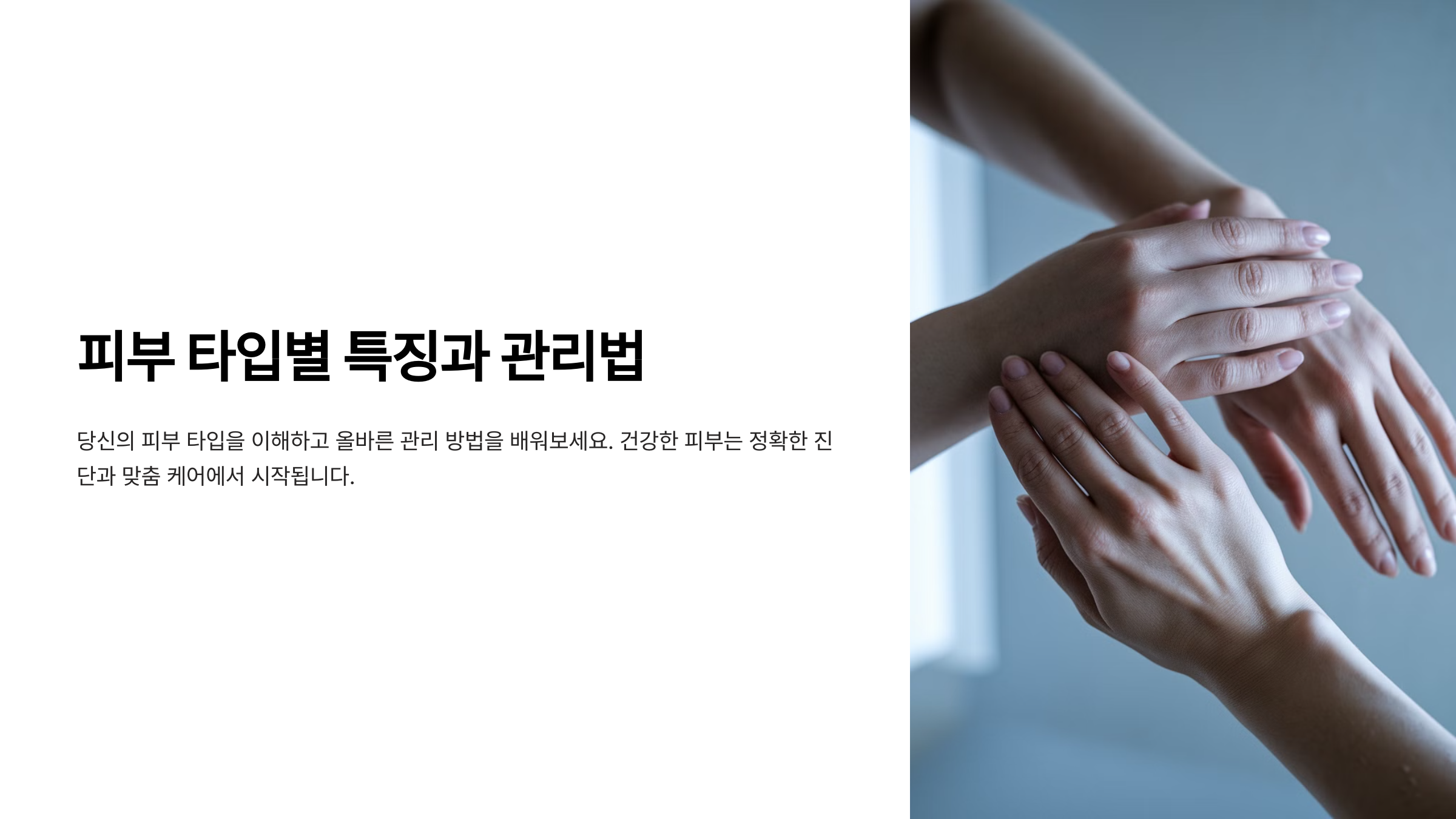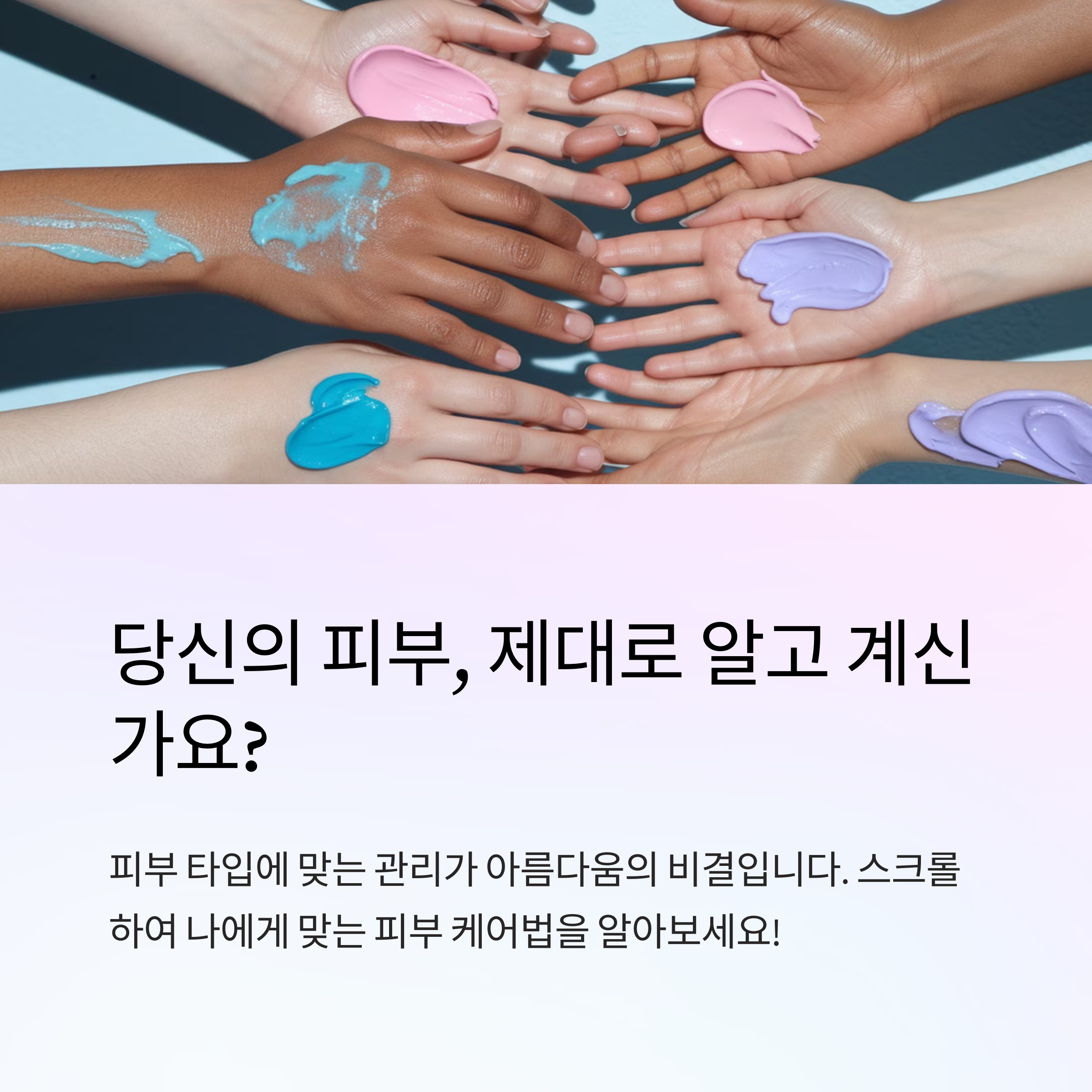 피부 관리의 첫걸음은 자신의 피부 타입을 정확히 아는 것이에요! 😊 건성, 지성, 복합성 등 피부 타입에 따라 필요한 케어 방법이 다르기 때문에 내 피부 상태를 제대로 파악하는 것이 중요해요.