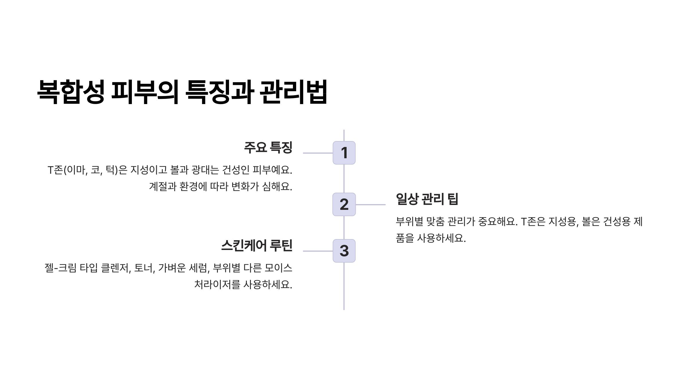 A2. 복합성 피부는 부위별로 다른 케어가 필요해요! 예를 들어, T존에는 유분 조절 제품을, U존에는 보습 제품을 사용하는 멀티 케어가 효과적이에요. 😊