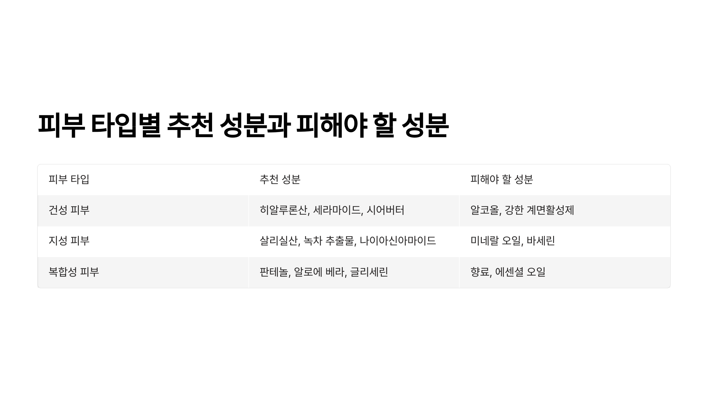 | 피부 타입 | 추천 성분 | 피해야 할 성분 |