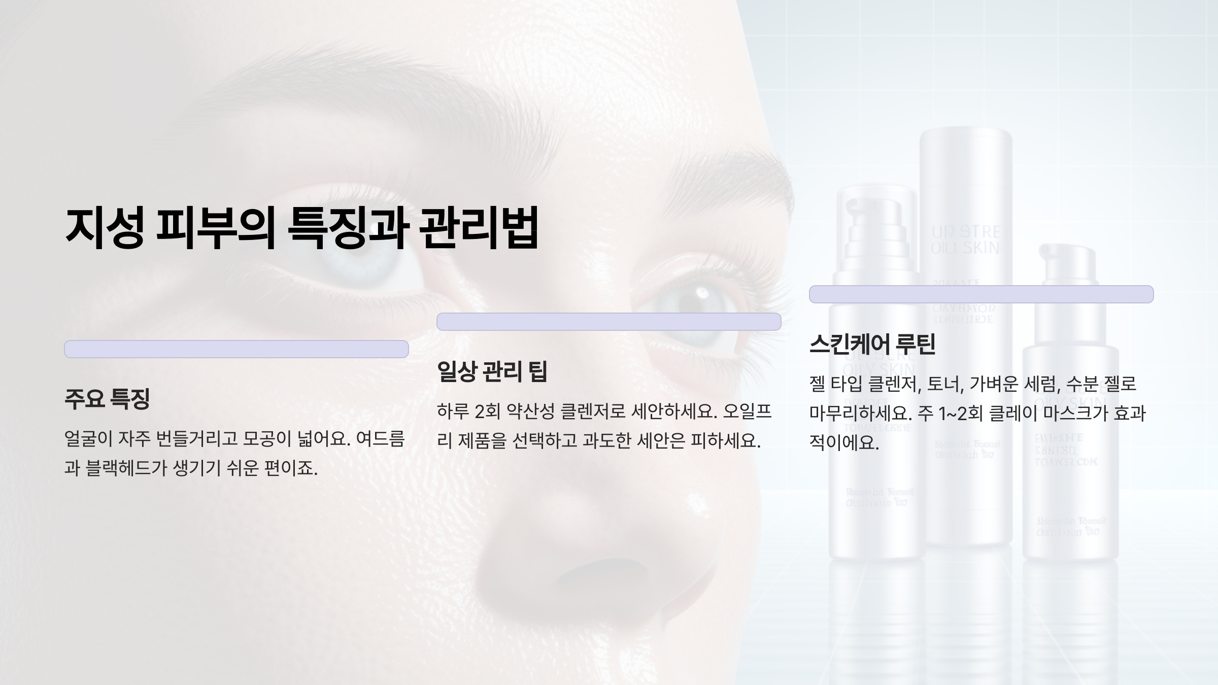 그럼 다음으로 지성 피부의 특징과 관리법을 알아볼까요? 👉