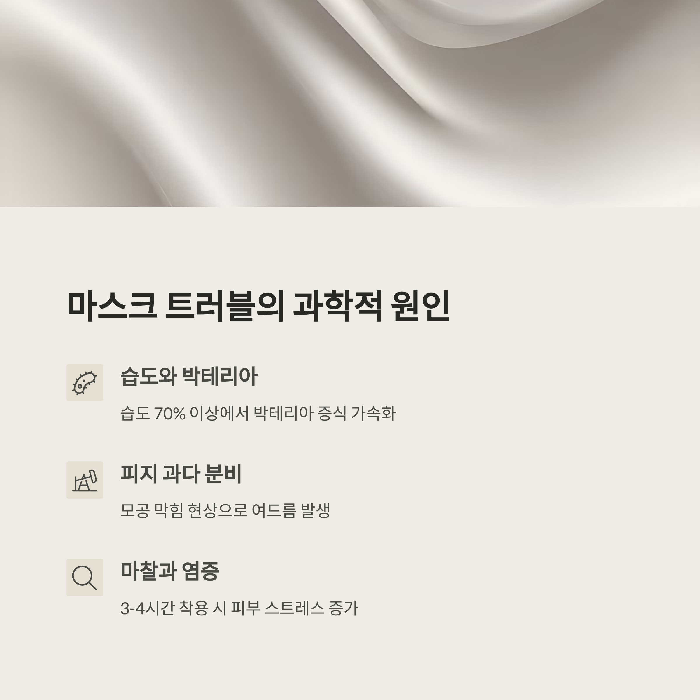 마스크 트러블은 단순히 열 때문만이 아니에요. **피부 마찰, 습도 상승, 세균 번식**이 한꺼번에 일어나기 때문에 피부가 예민해지고 염증성 트러블이 생기기 딱 좋아요. 🧪