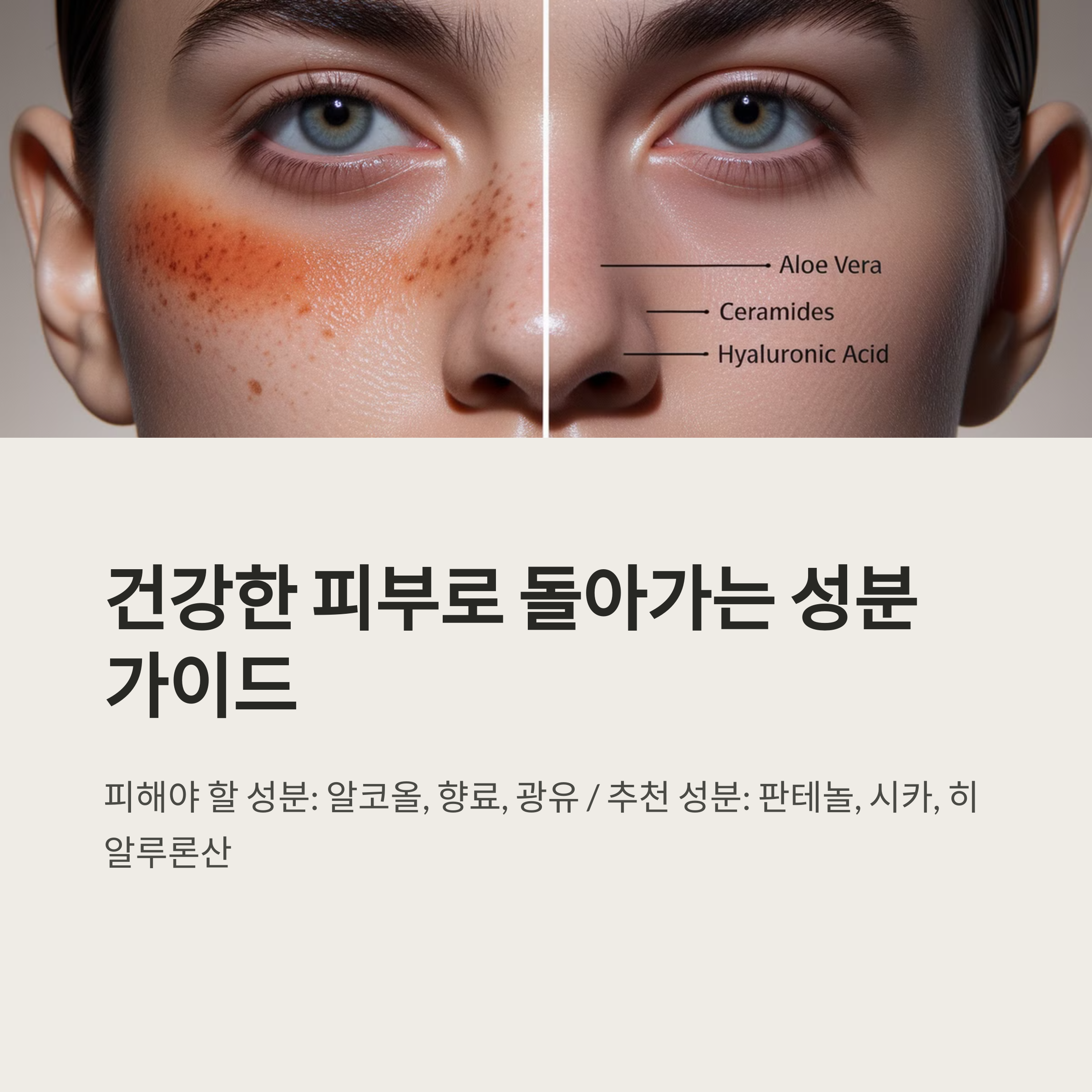 | 저녁 | 미온수 세안 → 진정 앰플 → 수딩젤 or 시카크림 | 병풀, 티트리, 마데카소사이드 |