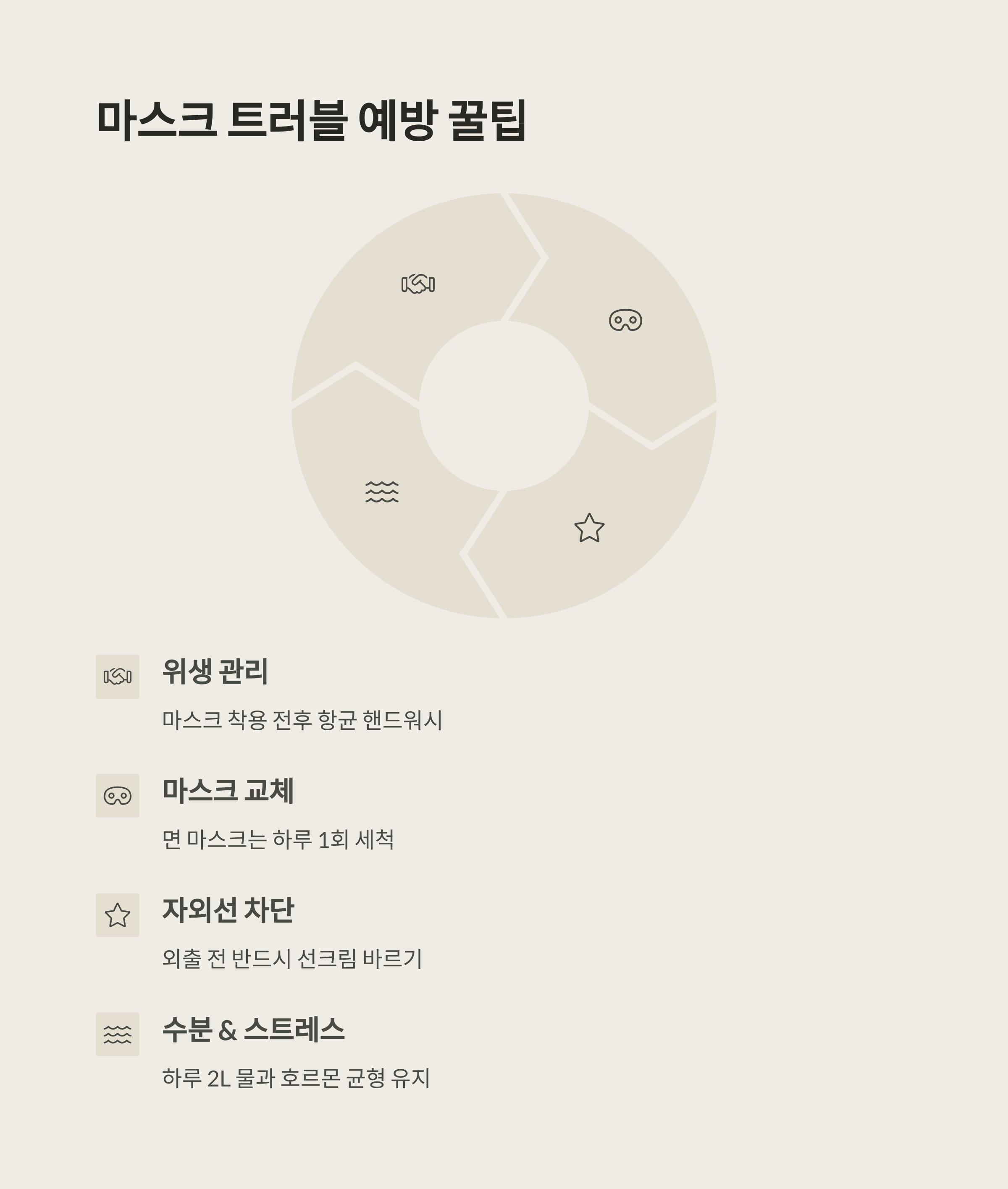 마스크 때문에 피부가 확 뒤집어졌다면 무조건 먼저 해야 할 건 👉 **자극 최소화 + 진정**이에요.