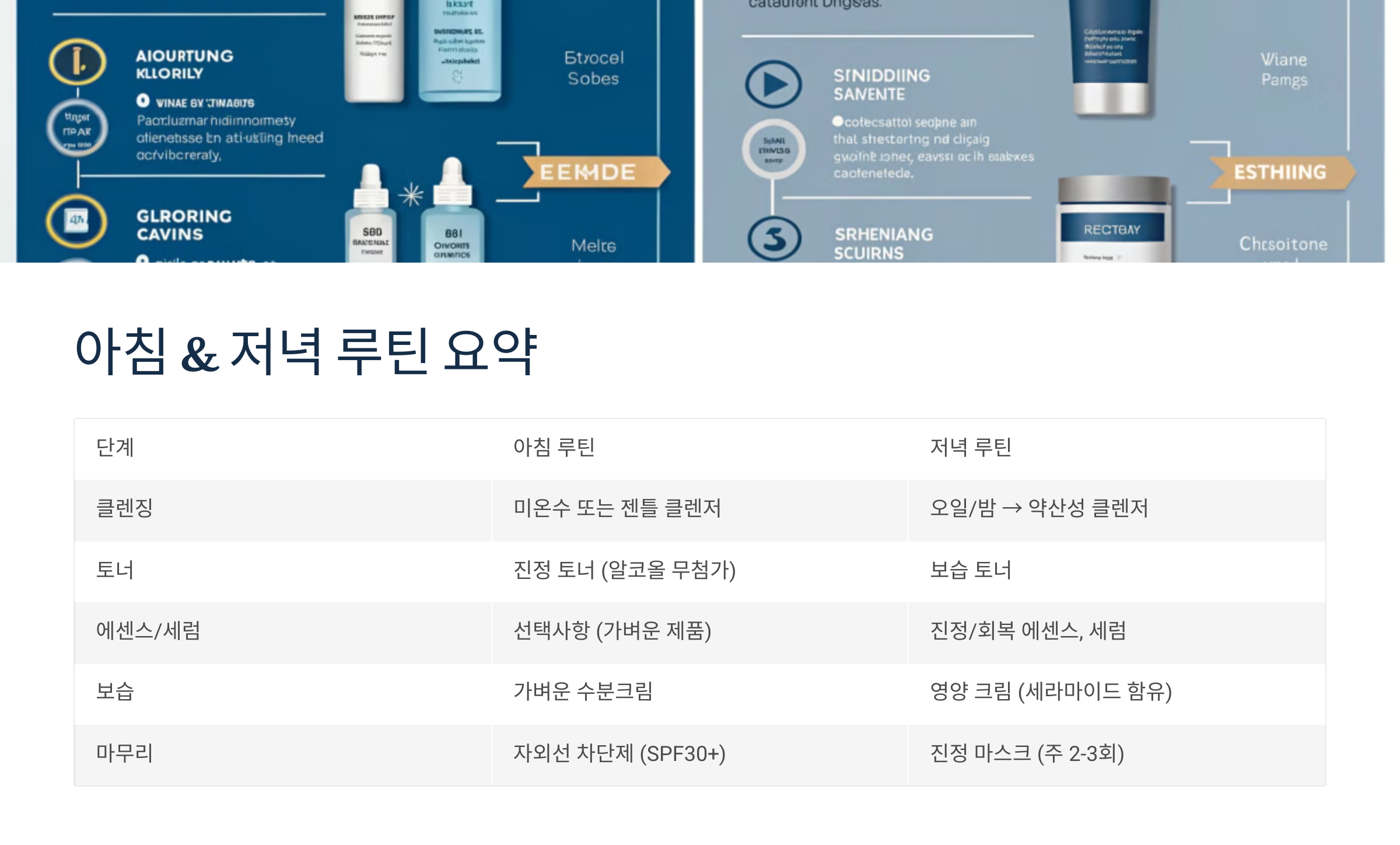 | 1 | 클렌징 오일 + 약산성 클렌저 | 식물성 오일, pH 5.5 | 노폐물 제거, 자극 최소화 |