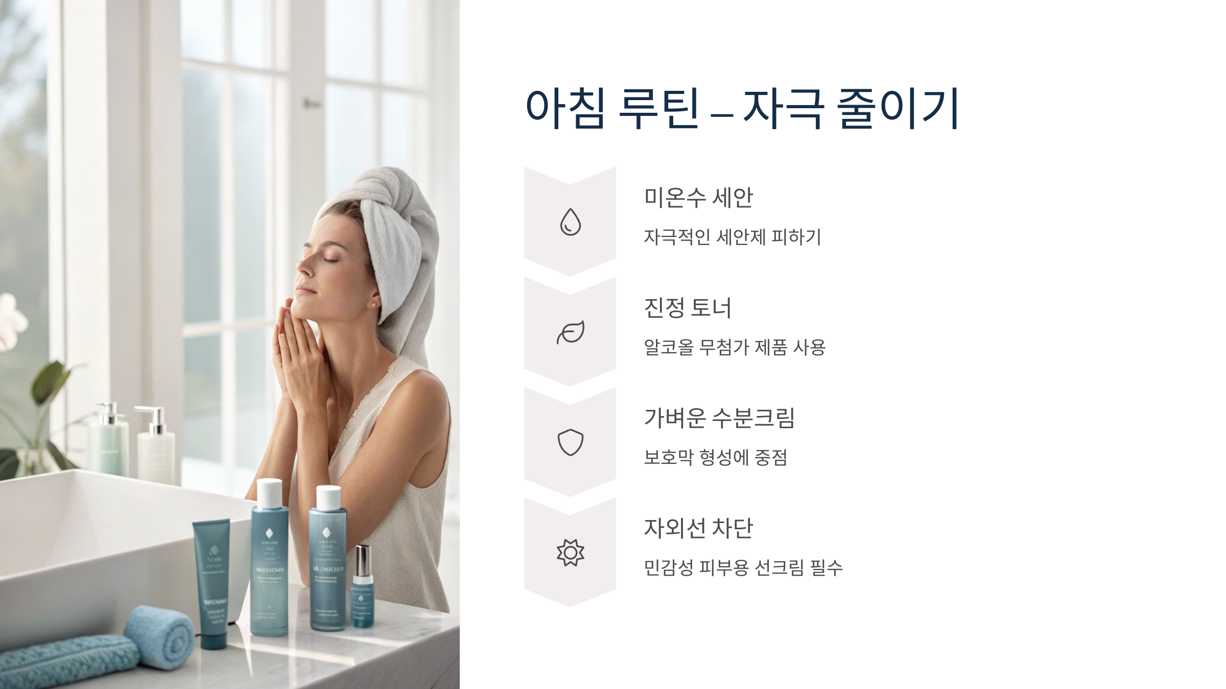 민감성 피부는 ‘덜어내는 습관’이 가장 중요해요. 제품보다 더 큰 영향력을 가지는 게 바로 우리의 생활 습관이니까요 😊