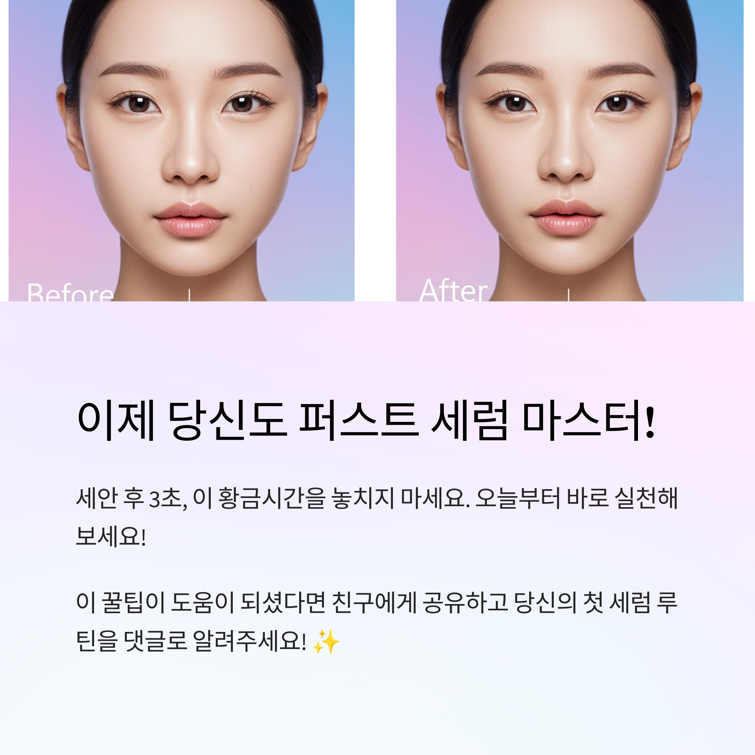 꼭 기억하세요. **3초 안에 바르고**, **피부에 맞는 제품을 고르고**, **순서 지켜서 레이어링**! 이 세 가지만 지키면 퍼스트 세럼만으로도 피부가 훨씬 달라질 수 있어요.