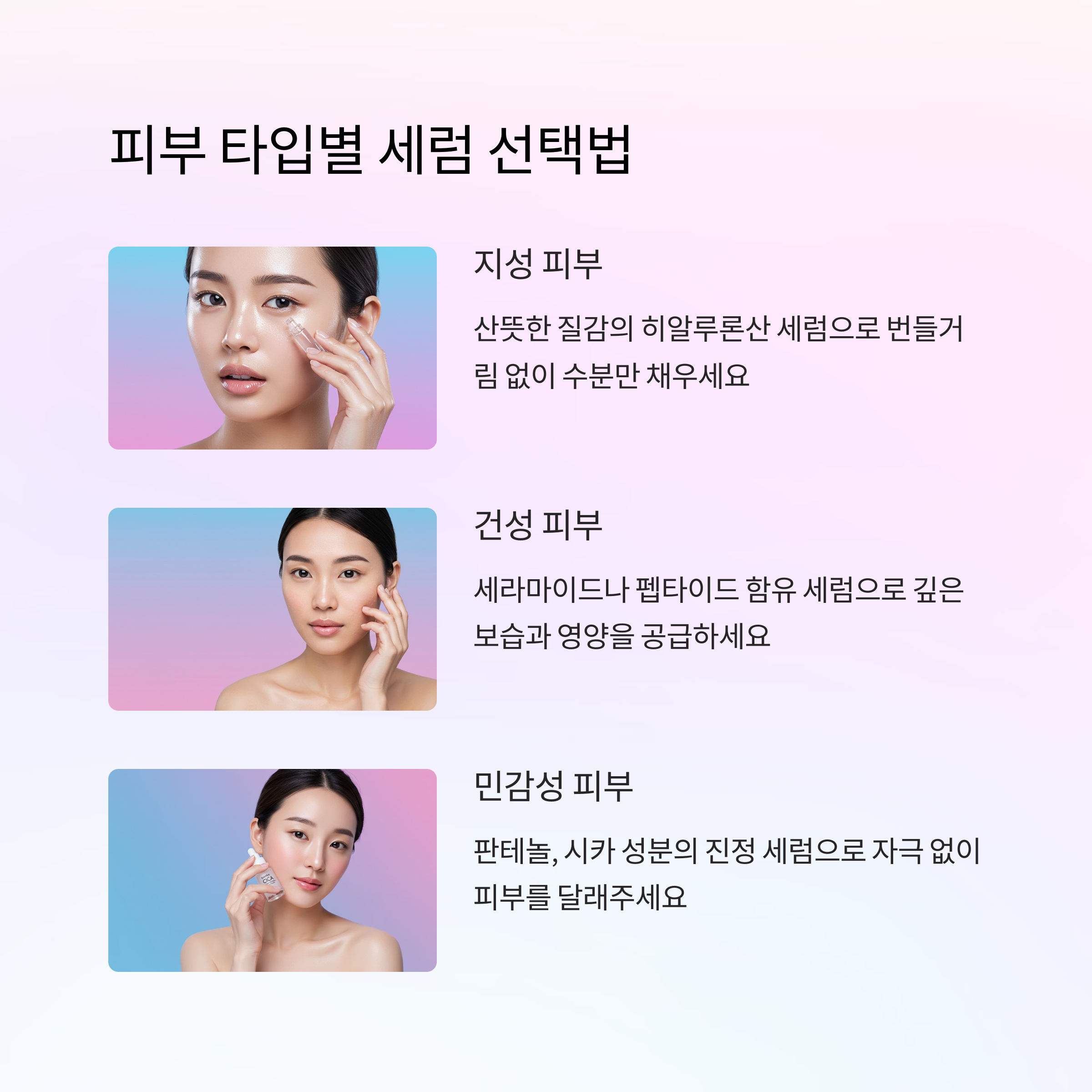 퍼스트 세럼도 내 피부 타입에 맞춰 골라야 효과가 극대화돼요. 수분이 부족한 건성은 히알루론산이나 세라마이드 성분이 좋고, 민감성은 병풀, 판테놀 같은 진정 성분이 들어간 제품을 고르면 좋아요.