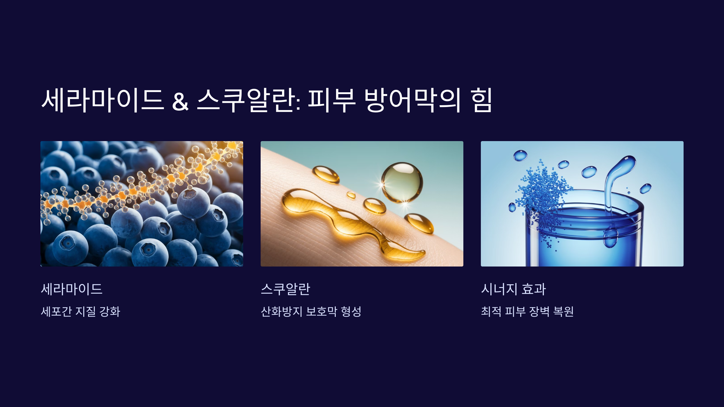마지막으로, 피부의 ‘기초 체력’을 책임지는 성분! 바로 세라마이드와 스쿠알란이에요.