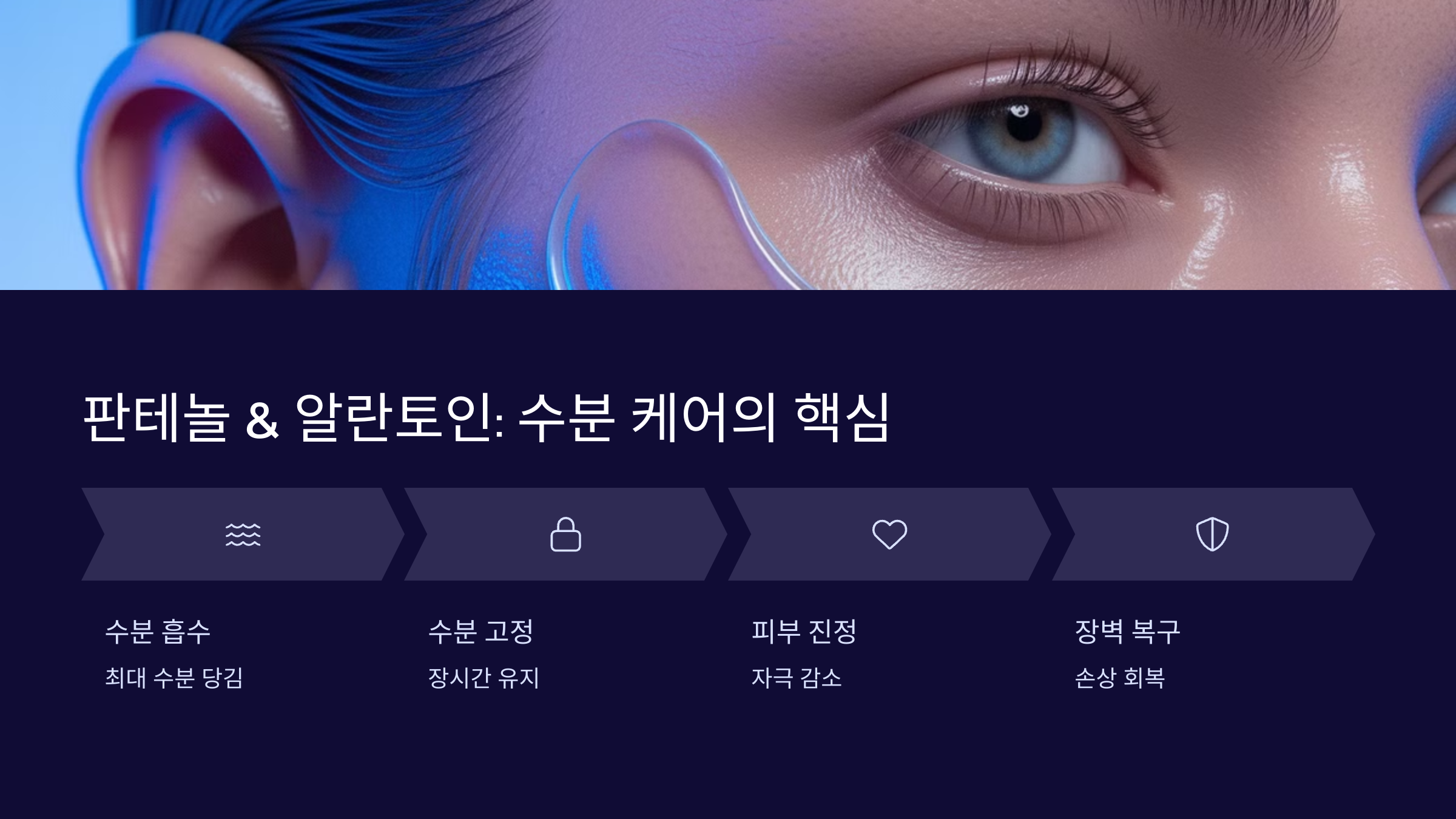 판테놀은 수분 유지와 장벽 회복에 효과적이고, 알란토인은 자극 받은 피부를 부드럽게 만들어줘요.